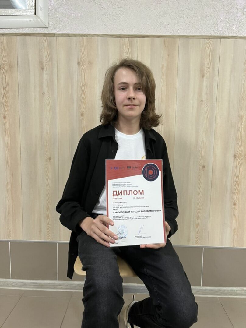 Микола ПАВЛОВСЬКИЙ, учень 9 класу Роменського ліцею № 1 ім. П.І. Калнишевського Роменської міської ради Сумської області здобув ІІІ місце на фінальному етапі Всеукраїнської учнівської олімпіади з хімії. Це вагоме досягнення стало результатом наполегливої праці, глибоких знань і щирого захоплення предметом.
