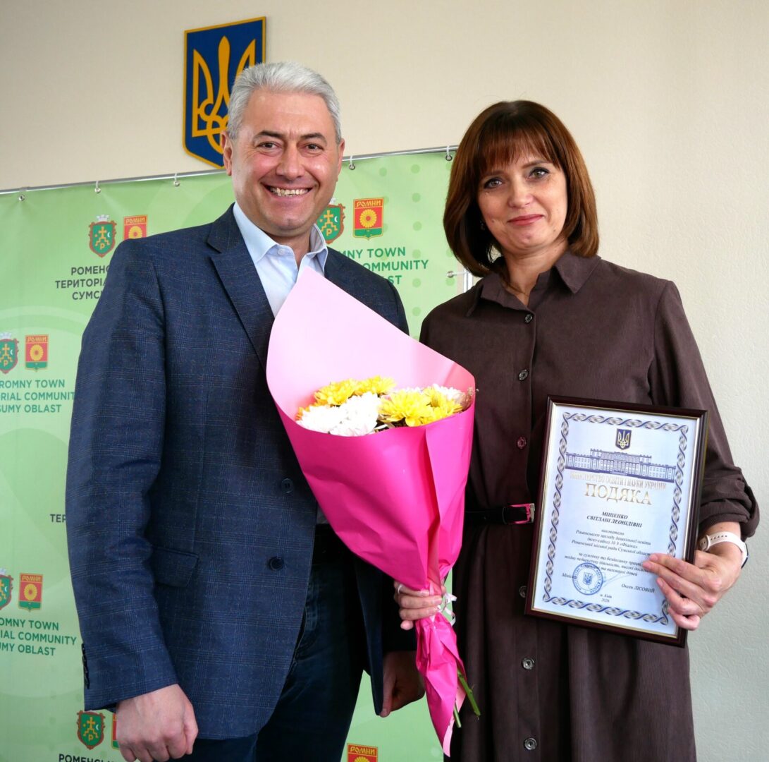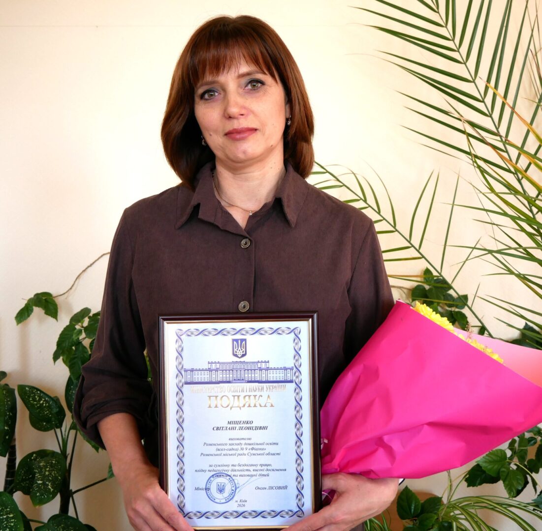 Оскільки вихователь Роменського закладу дошкільної освіти №9 «Фіалка» Світлана МІЩЕНКО не мала змоги особисто бути присутньою на зустрічі з Міністром, Олег СТОГНІЙ мав почесну місію вручити грамоту Світлані Леонідівні під час оперативної наради. Міський голова подякував їй за високий професіоналізм, любов до вихованців та відданість своїй справі.