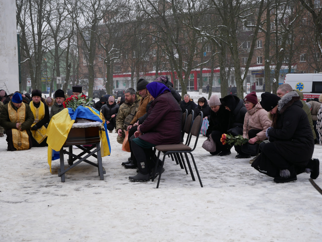 🕯Створивши живий коридор, на колінах, зі сльозами на очах, скорботою та болем у серці від непоправної втрати, земляки прощались із Воїном. Лунала спільна молитва за упокій душі Воїна, де священнослужителі провели над тілом загиблого чин відспівування.