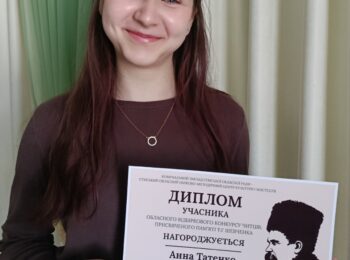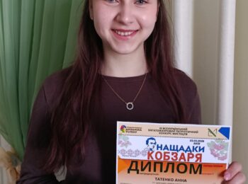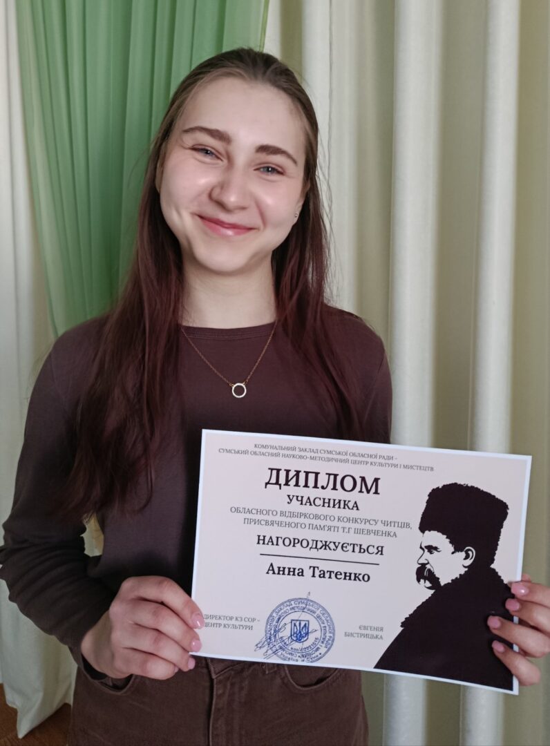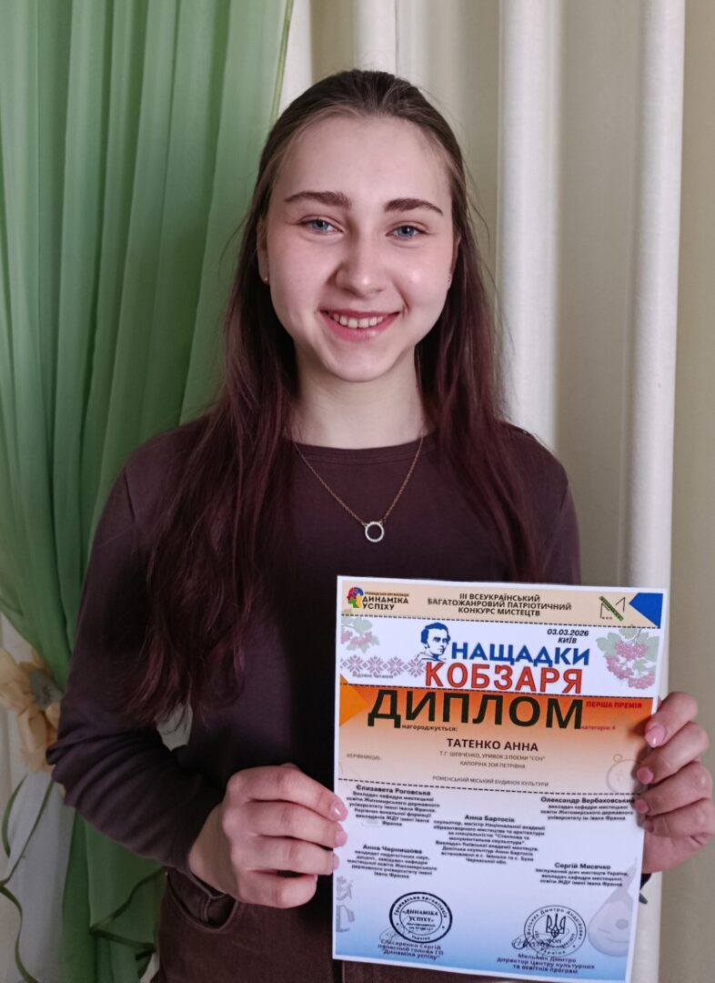 - ТАТЕНКО Анну, яка виборола І місце на Всеукраїнському багатожанровому патріотичному конкурсі мистецтв «НАЩАДКИ КОБЗАРЯ» та взяла участь в обласному відбірковому конкурсі читців, присвяченому пам’яті Тараса Григоровича Шевченка.