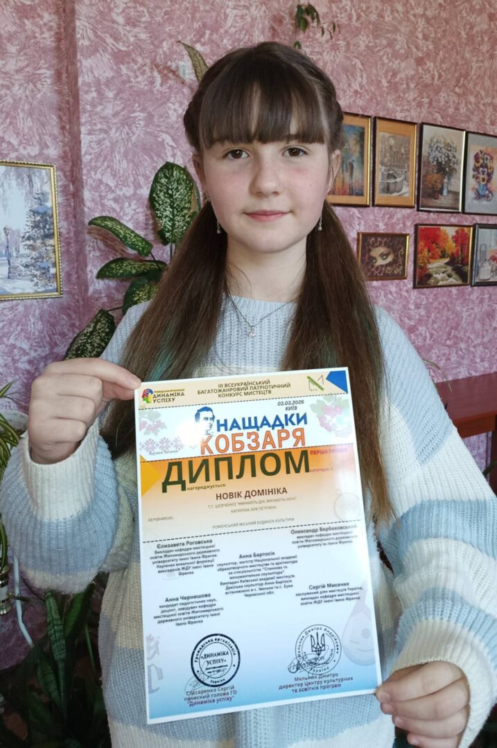 - НОВІК Домініку, яка виборола І місце на Всеукраїнському багатожанровому патріотичному конкурсі мистецтв «НАЩАДКИ КОБЗАРЯ» та ІІІ місце в обласному відбірковому конкурсі читців, присвяченому пам’яті Тараса Григоровича Шевченка;
