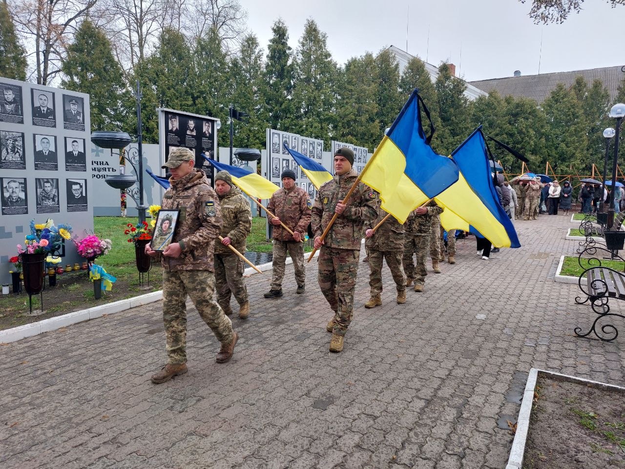 На Алеї Слави під час церемонії прощання з військовослужбовцем, присутні поклали квіти та схилили голови на знак глибокої поваги.