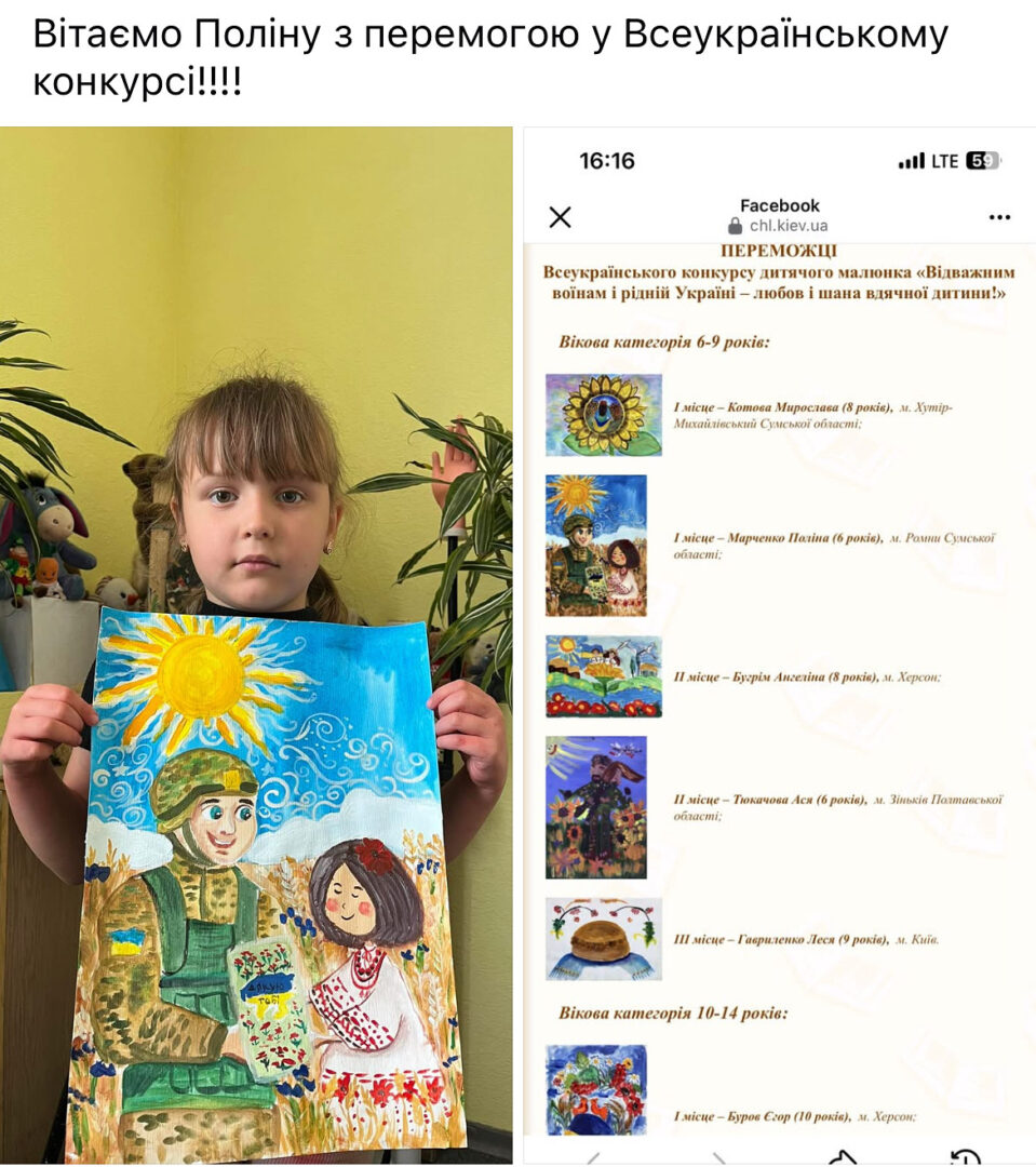 Юна вихованка дитячої художньої аматорської студії IV_ART_STUDIO — МАРЧЕНКО Поліна (6 років) виборола перемогу у своїй віковій категорії у Всеукраїнському конкурсі дитячого малюнка «Відважним воїнам і рідній Україні – любов і шана вдячної дитини!» (вікова категорія 6-9 років).