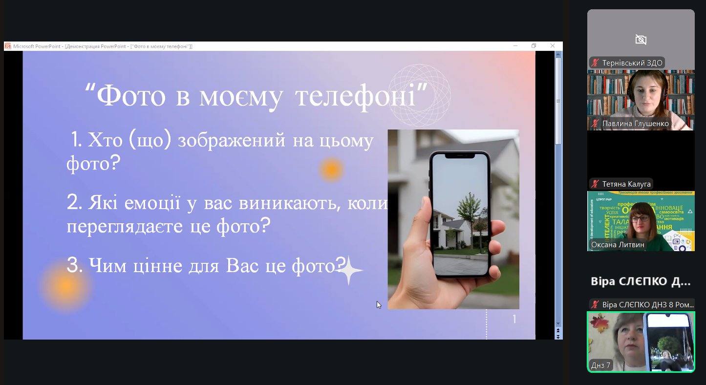 Практичний психолог Ірина КОВАЛЕНКО залучила учасників до виконання психологічної техніки «Фото в моєму телефоні». Через асоціації з особистими світлинами педагоги мали змогу поділитися власними почуттями, усвідомити свої ресурси та відчути підтримку колег. Ця вправа сприяла створенню довірливої, позитивної атмосфери під час заходу.